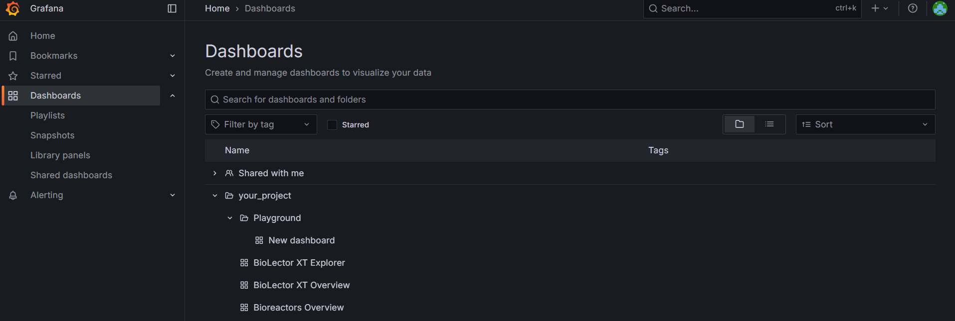 Once access is granted, your project will have a subfolder under your Dashboards in Grafana. Depending on the setup, some pre-existing dashboards might be directly nested under the subfolder to which users will have read-only access. A subfolder named Playground is fully accessible to the user, in which dashboards can be custom-tailored (this feature is currently reserved for the UNLOCK affiliated platforms).
