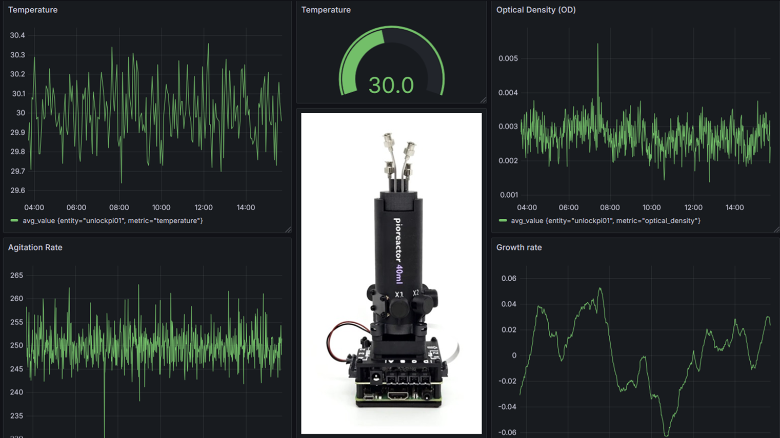 In Grafana, data must be queried by using the query language corresponding to its data source. As we are using TimescaleDB, which is an extension of postgreSQL, this language is SQL (Structured Query Language). A handy query Builder is selected by default to help out those with less familiarity with the relevant query language. If you are comfortable using SQL, you can select the Code section and directly paste your queries. Be mindful to select the Time series Format. It can also be convenient to work with variables, which can elevate your dashboards to an interactive level. Refer to the image below for a static example of a pioreactor dashboard.